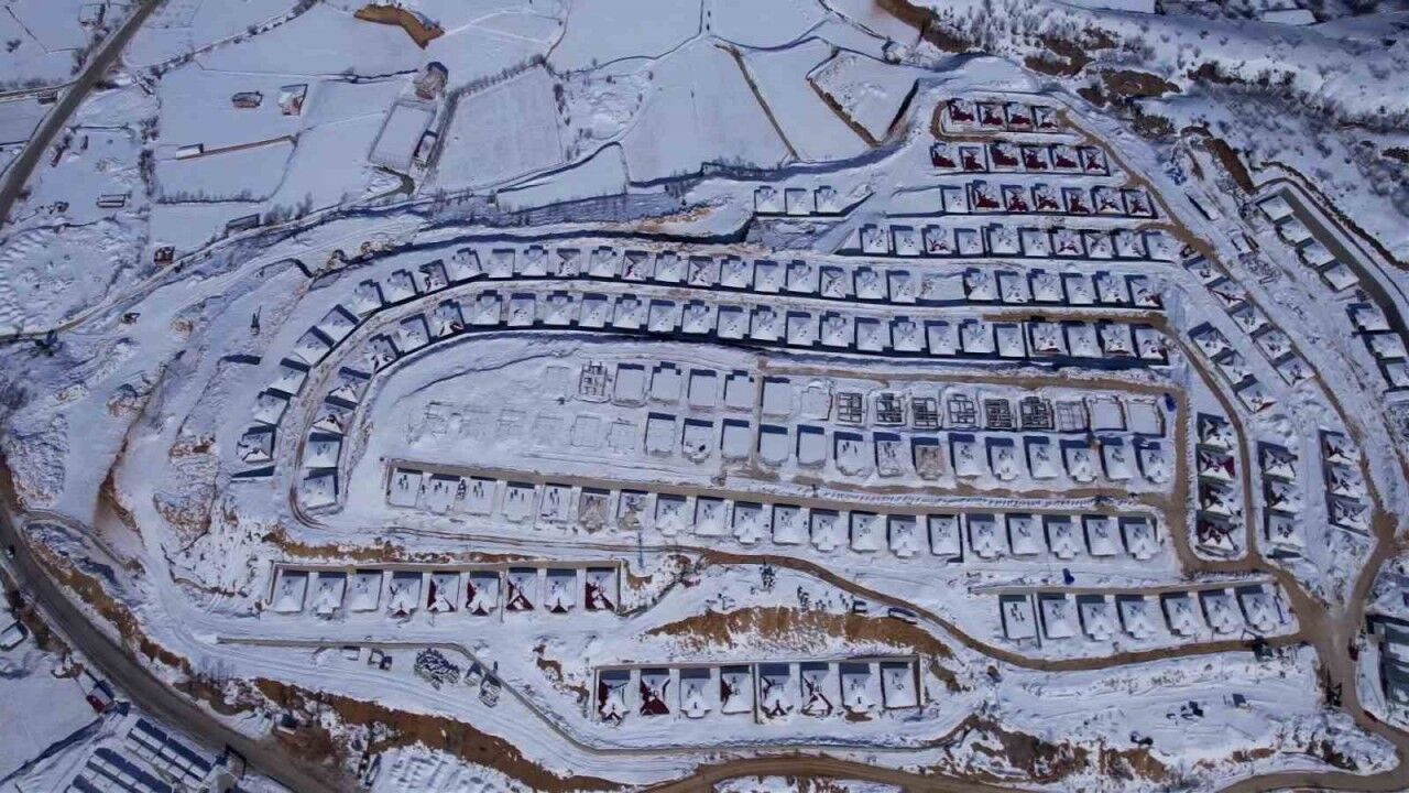 Köy evlerinin yapımı sürerken, geçtiğimiz hafta etkili olan yağışı köy evlerini beyaza bürüdü. Dron ile görüntülenen köy evleri görsel şölen sundu. Çelikhan ilçesinde hakim bir tepede sıralı olarak yapılan köy evleri ilçeye ayrı bir güzellik kazandırdı.